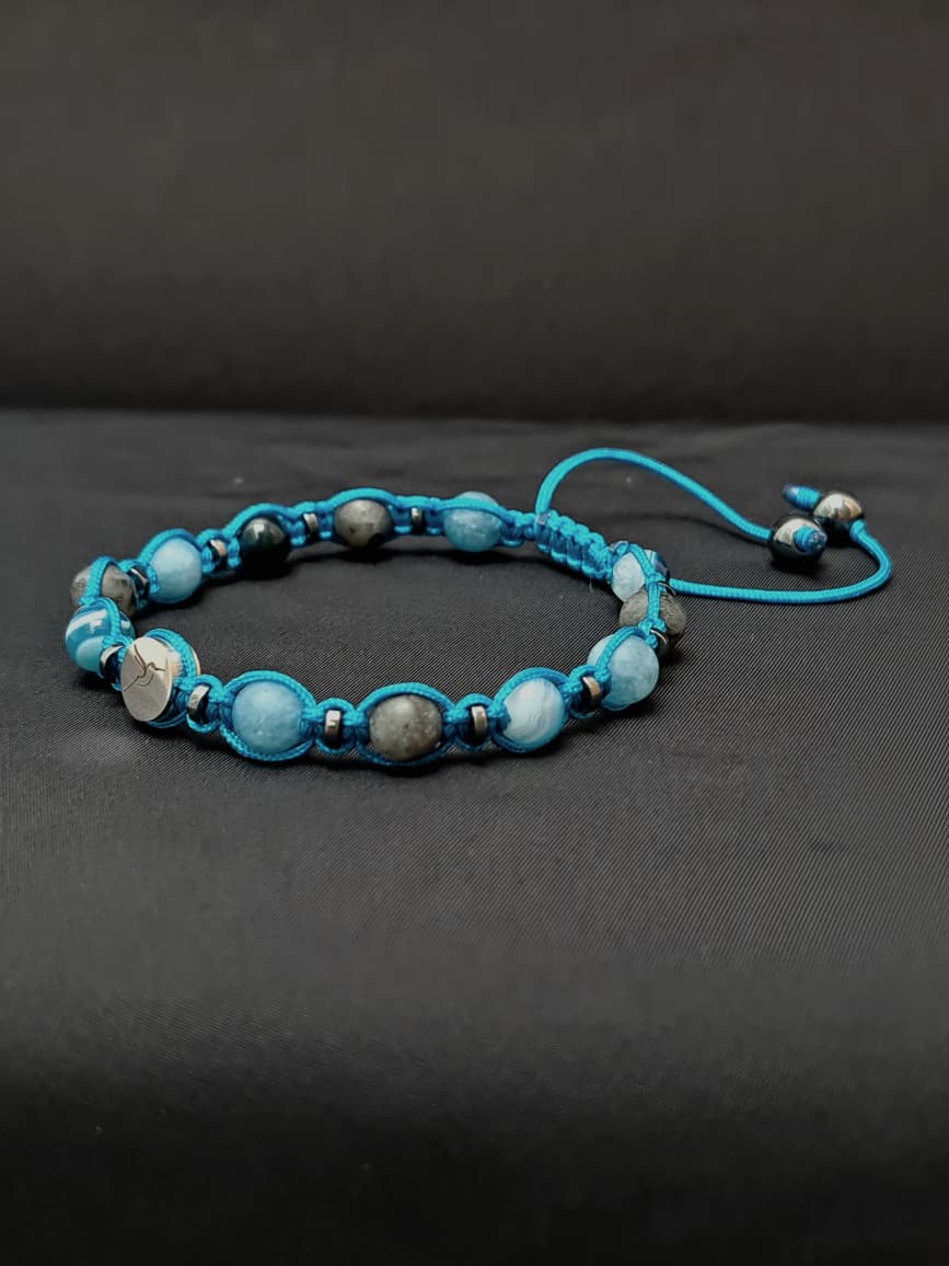 Una pulsera creada para quienes buscan calma, claridad y conexión profunda con su mundo interior. Cada piedra ha sido seleccionada para trabajar en sintonía con la energía de la serenidad y la introspección consciente. El jade azul favorece la paz interior, equilibrando tus emociones y ayudándote a fluir con suavidad en momentos de tensión. La ágata azul estimula la comunicación consciente y auténtica, invitándote a expresarte desde la calma, la verdad y la armonía, ideal para quienes desean abrir y equilibrar el chakra garganta. La larvikita, con su brillo misterioso, potencia la introspección, la intuición y la claridad espiritual, además de protegerte frente a energías densas o no deseadas. Finalmente, la hematita aporta estabilidad, fuerza y conexión a tierra, ayudándote a mantener el equilibrio entre lo emocional, lo mental y lo espiritual.
